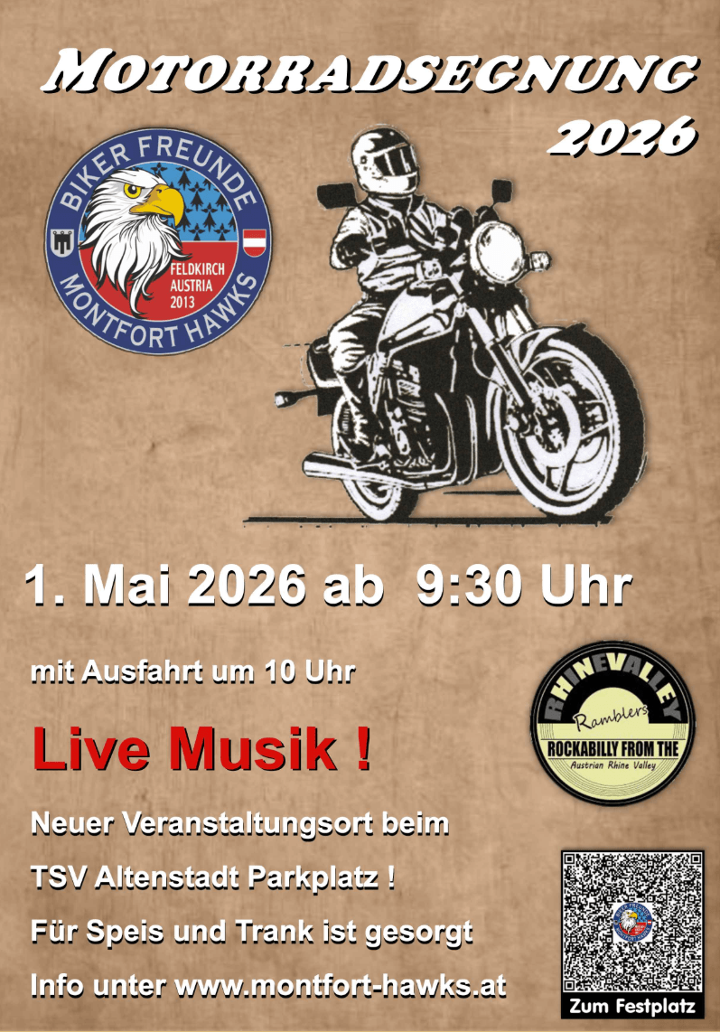 Die Bikerfreunde Montfort Hawks veranstalten am Donnerstag den 1. Mai um 9:30 die inzwischen traditionelle Motorradweihe mit anschließender Ausfahrt.